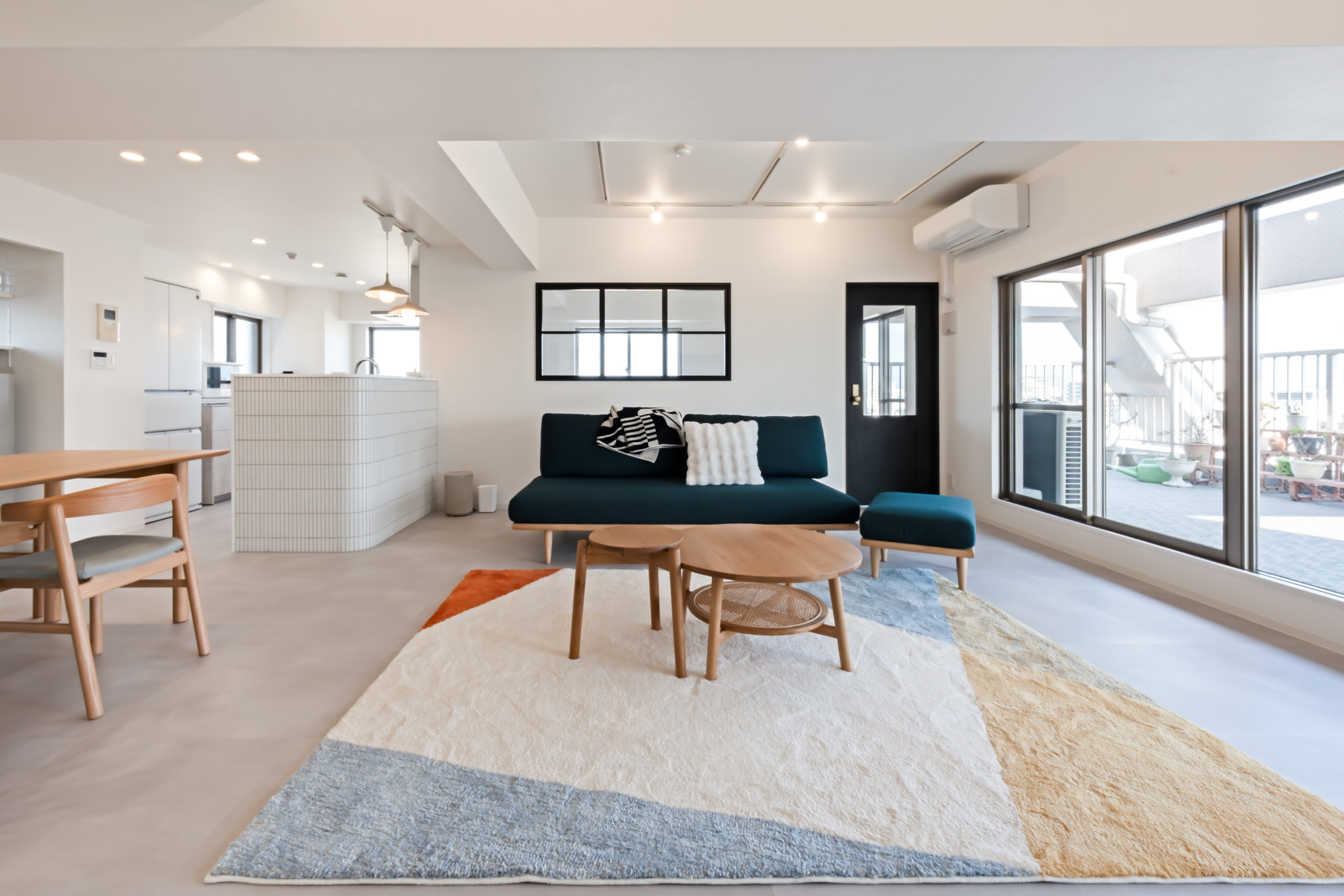 • カラフル家具とアール腰壁が映える、ゆとりのLDK。広い空間だからこそデザインが引き立ちます。
