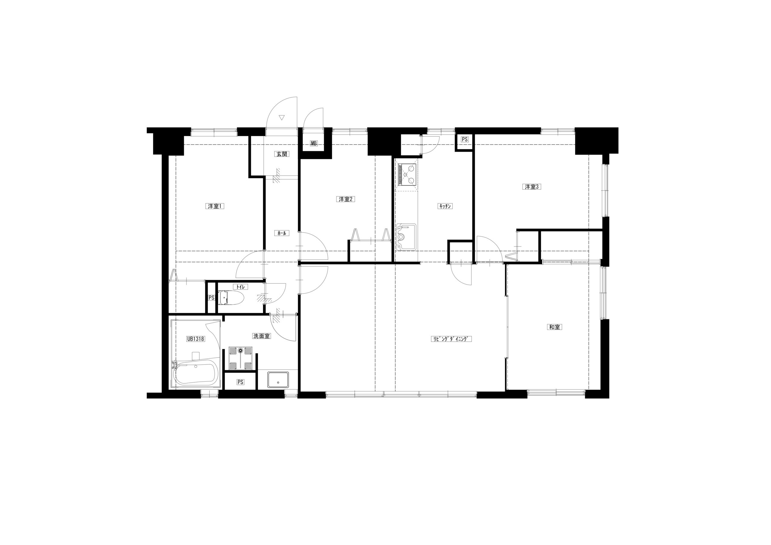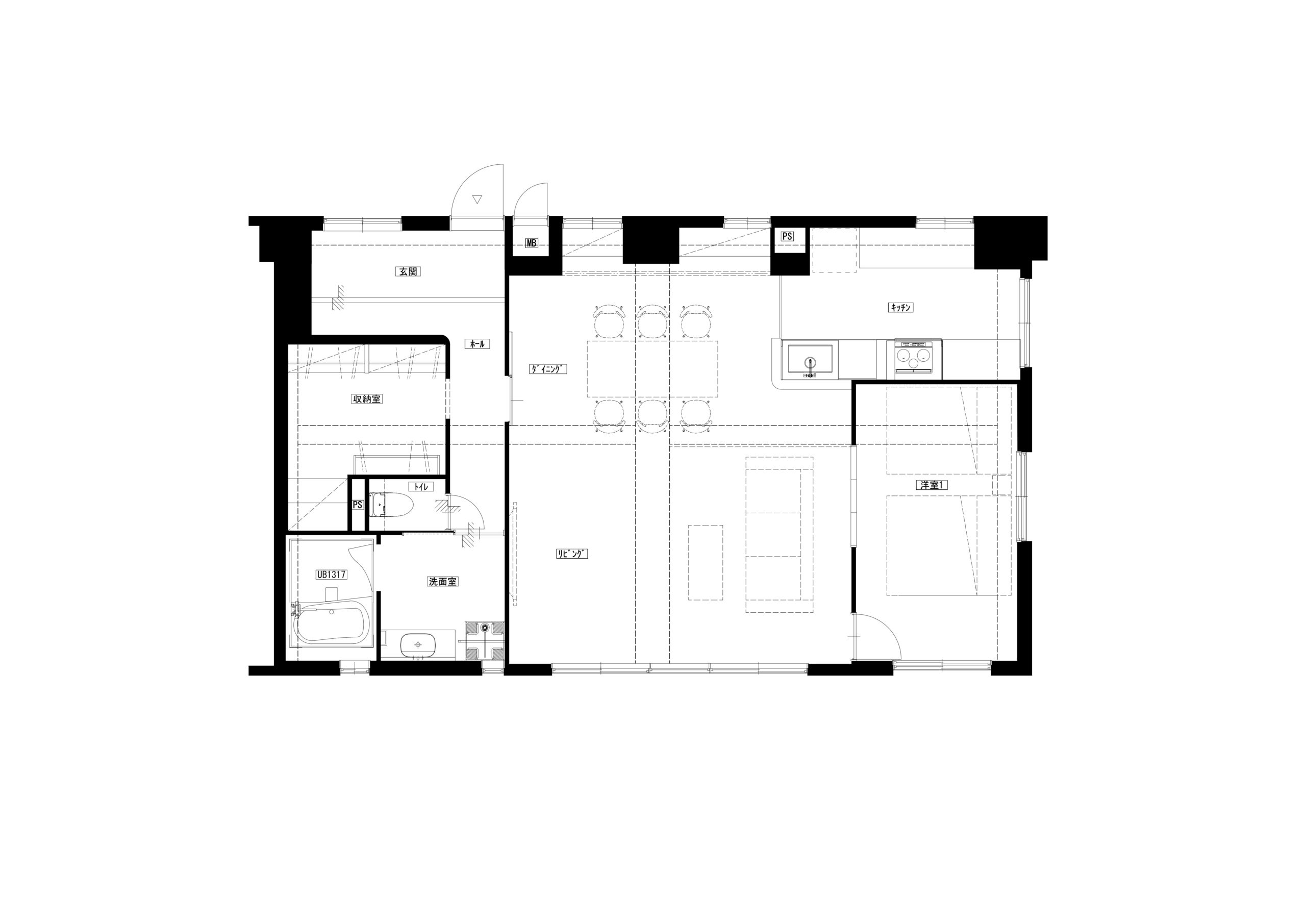 • 改修後平面図。リビングを横切る低い梁も、LDKを広く取ったことでデザインの一部のようになり、以前より気にならなくなっています。