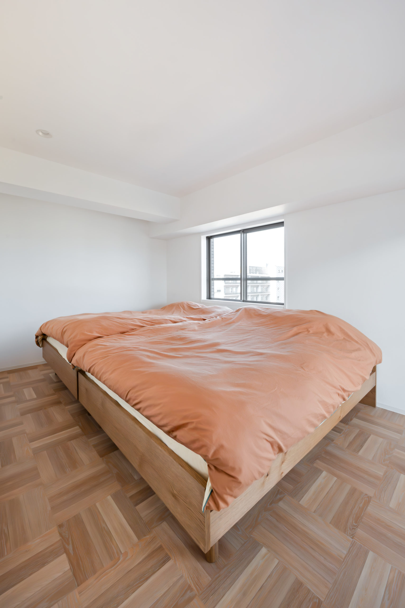 • 寝室の床はパーケットフロア調のフロアタイルに。LDKとは素材を変え、落ち着いた空間になりました。