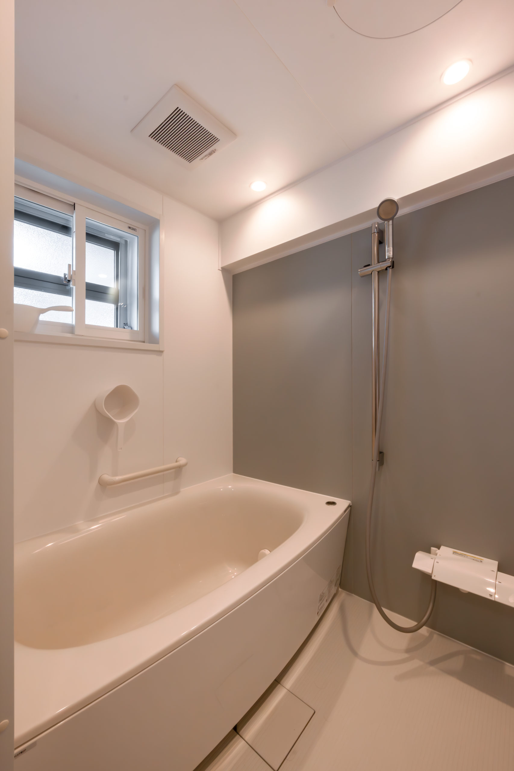 • グレイッシュグリーンのアクセントパネルで、おうち全体と雰囲気を合わせたユニットバス。ホワイトの内窓も取付して、デザイン性と機能性もプラス。