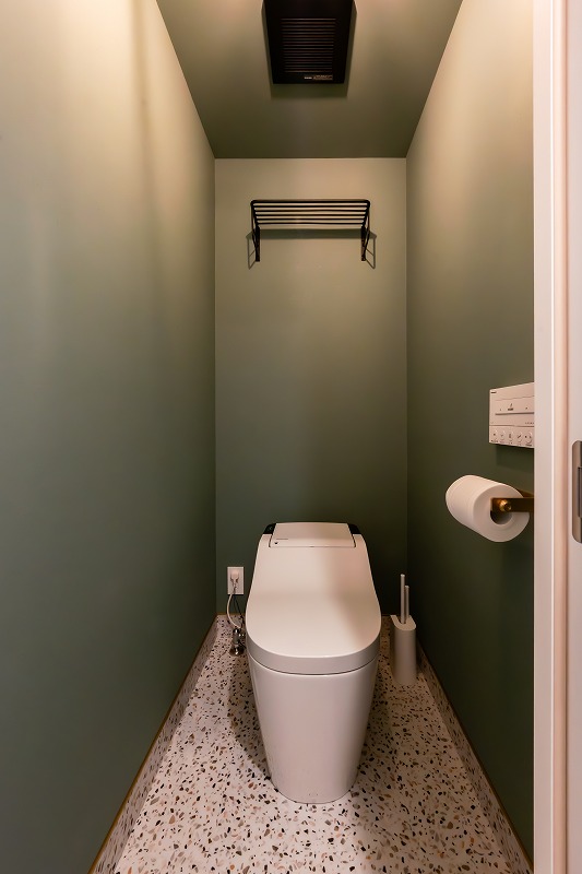 • 深いグリーンの落ち着きあるトイレ空間にも、テラゾーのフロアタイルでポップなアクセントを。