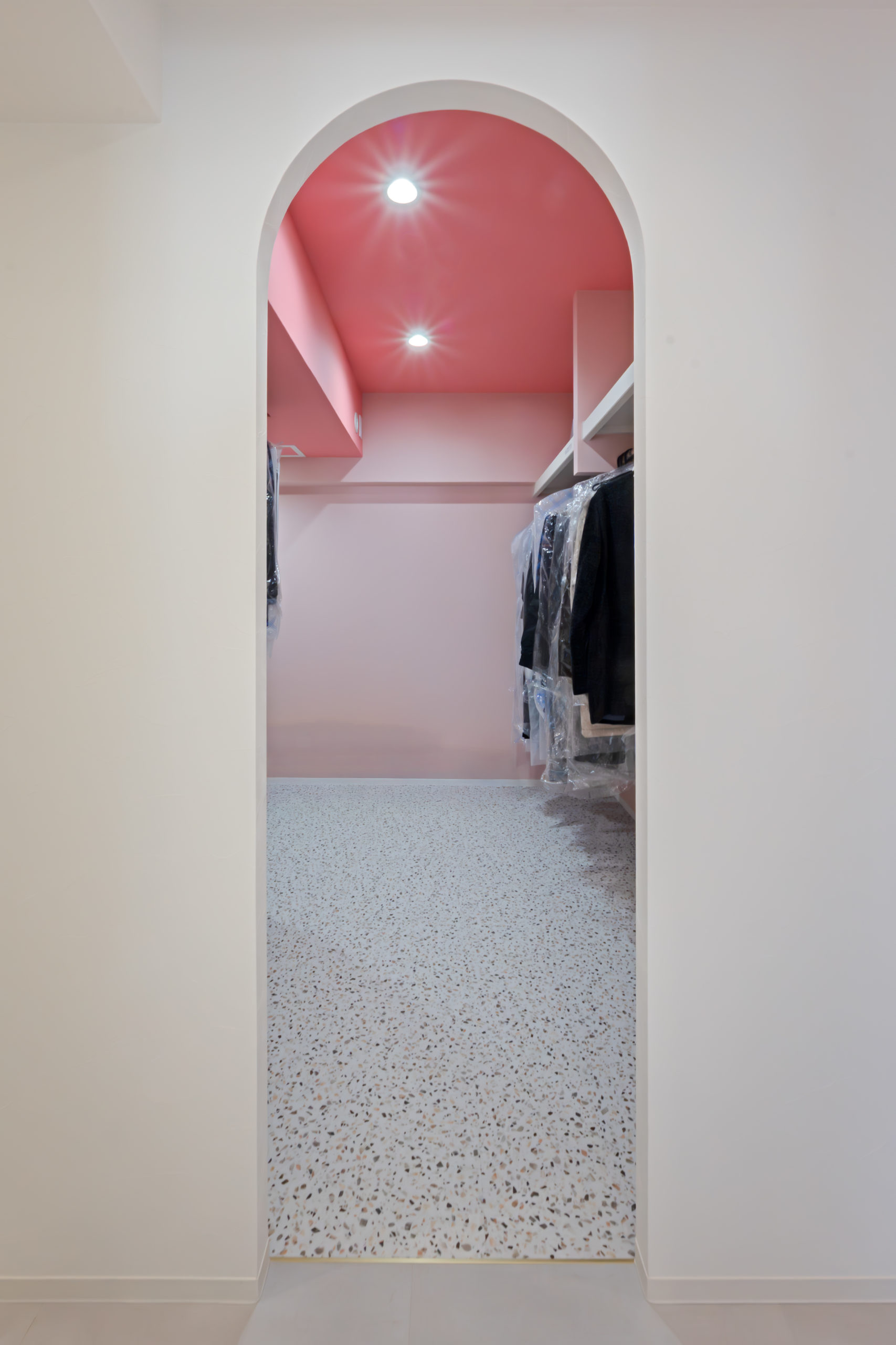• 濃淡のピンククロスとテラゾーフロアタイルで、遊び心いっぱいのウォークインクローゼット。